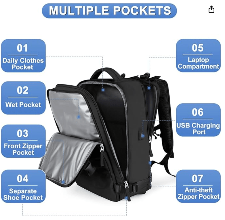 This backpack got me through a 2 week excursion through Europe and 4 countries like nothing! 7 pockets for every item. MANY items can fit, clothing, laptops, tablets, drinks. It also includes exterior safety clips to be sure the bag is securely fastened behind you while wearing.